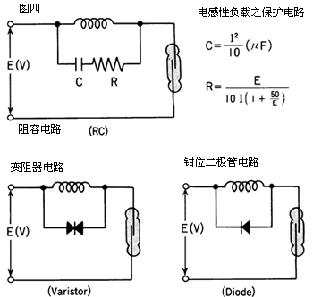 當將干簧管用于感性負載,例如電動機÷繼電器線圈、螺線管等,其觸點在(負載電路)觸點開路時將加有高感生電壓。這種(瞬態(tài))高感生電壓可能會損害干簧管或者明顯地降低干簧管地壽命。因此建議采用保護電路,例如阻容(吸收)電路、變阻器或鉗位二極管電路(見圖四)。